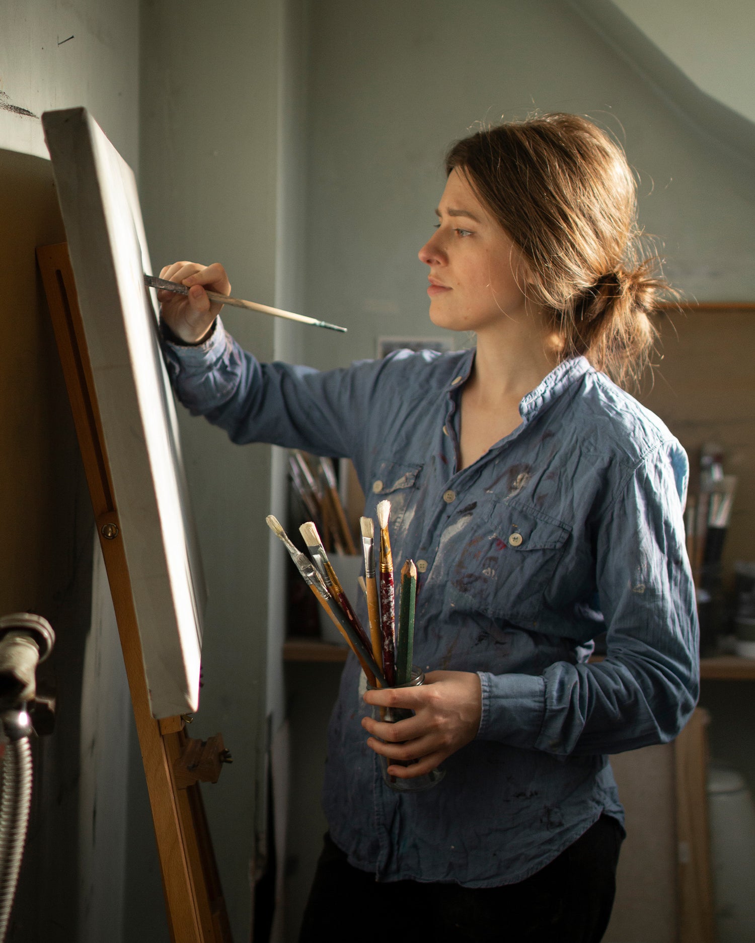 Julia Hallström Hjort (b. 1991, Lund) is a Swedish artist based in Malmö. With an academic background in medicine and psychology, she turned to painting as a distraction from chronic pain and art became a path to a calmer lifestyle. She explores a wide range of techniques, shifting between figurative, abstract and large-scale mural work. Characterised by a calm visual language and a preference for muted tones, her art draws inspiration from Nordic design and nature. For Julia, a painting can be powerful and charged with deeper meaning, but it can also simply exist as something that brings beauty, colour and joy to the space it inhabits.