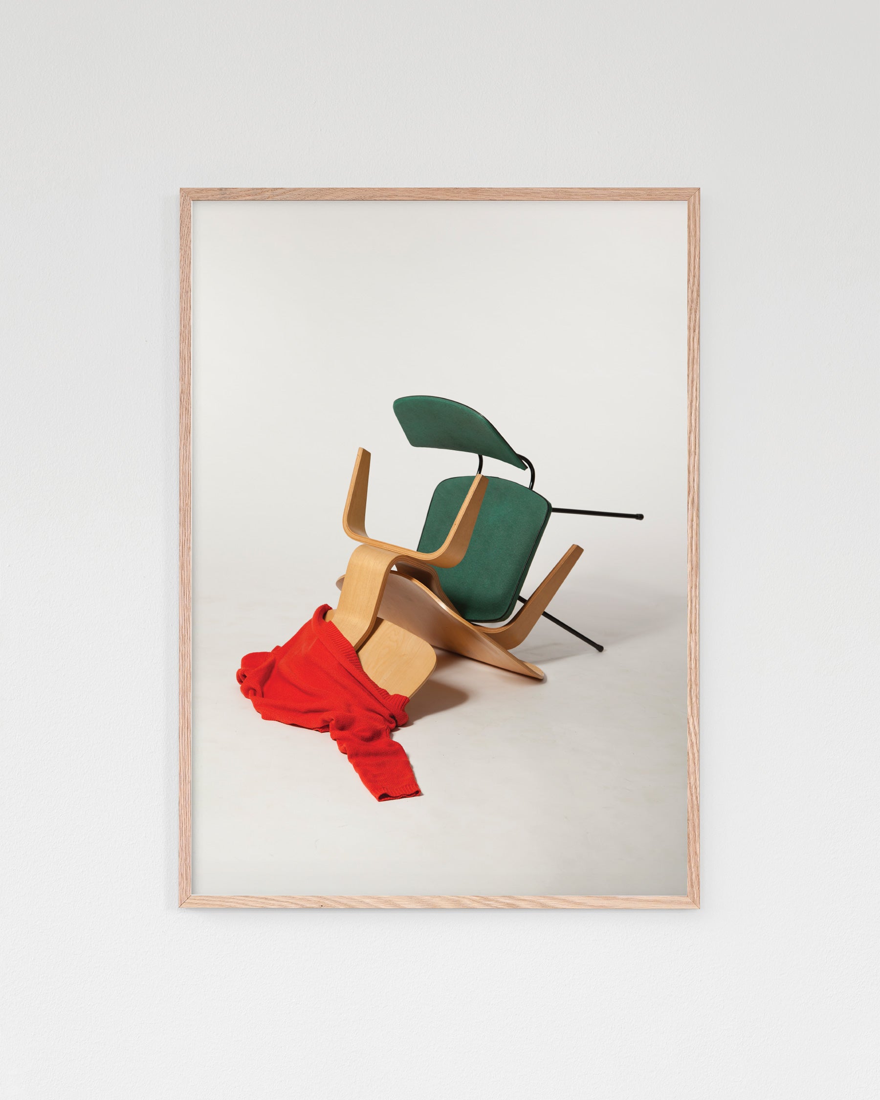 Photographic print from the “Chair Affair” series by Margriet Craens and Lucas Maassen. In this body of work, chairs are staged in ways reminiscent of couples caught in compromising positions, suggesting desire and character beyond function. Also a couple in life, the artists extend their reflections on intimacy to the objects around them – sitting as a physical pleasure, where thighs shift, hands caress, and bodies lean. First exhibited in 2015 as part of “The Vincent Affair” at Huis Nune Ville and later published in the book “Chair Affair” (Onomatopee), the series explores the intimate world of everyday objects.